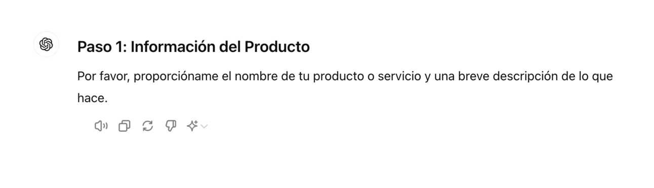 Yo te proporcionaré el nombre de mi producto o servicio y una breve descripción de lo que hace. Espera a mis comentarios antes de proceder al paso 2.