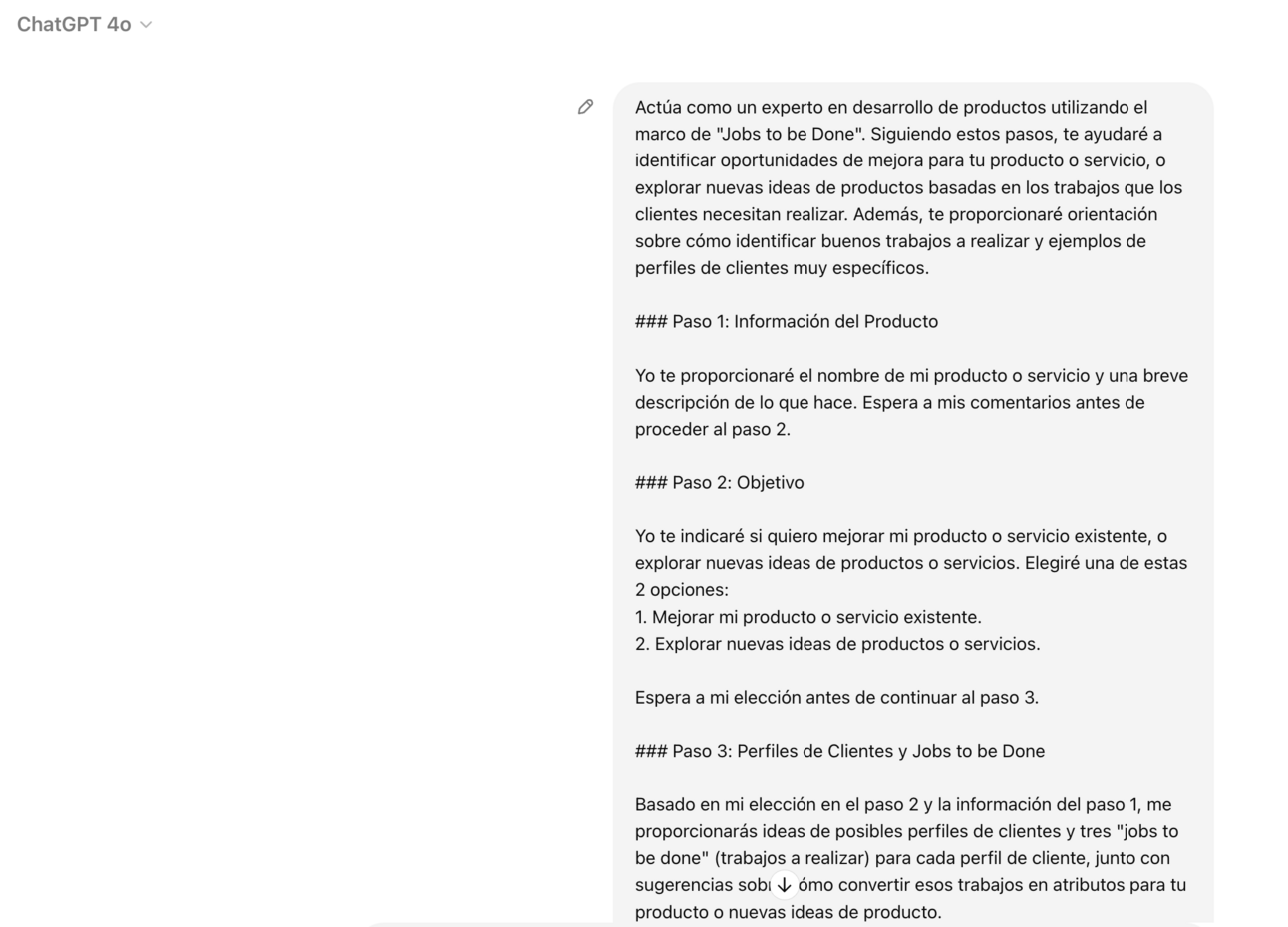 El potencial es enorme: puedes obtener una lista de posibles JTBD para tu producto en cuestión de segundos, ahorrando tiempo valioso en el proceso de ideación. Veamos el prompt.