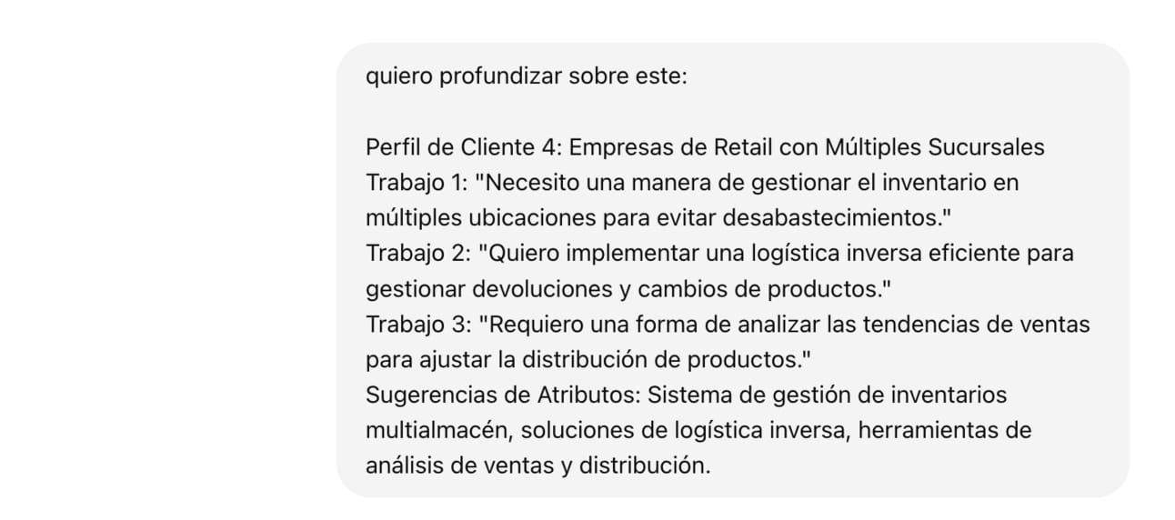 ChatGPT puede ayudarte a generar ideas de JTBD más rápido y desde perspectivas que quizás no hayas considerado. Puede proporcionarte un punto de partida para tu análisis o ayudarte a ampliar las ideas que ya tienes.