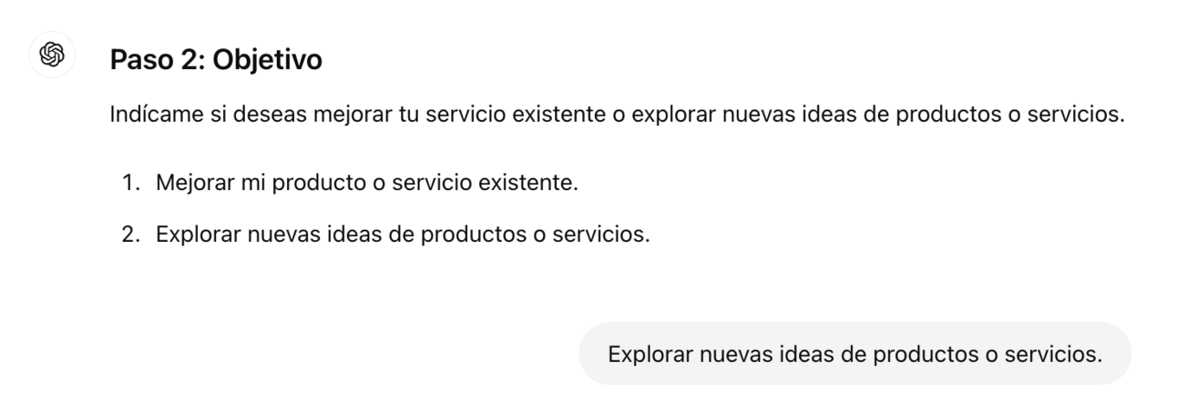 Yo te indicaré si quiero mejorar mi producto o servicio existente, o explorar nuevas ideas de productos o servicios. Elegiré una de estas 2 opciones: