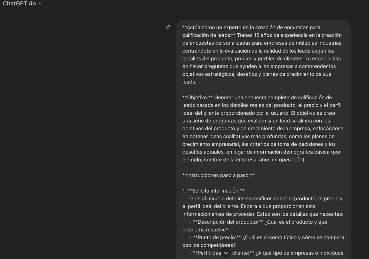 **Objetivo:** Generar una encuesta completa de calificación de leads basada en los detalles reales del producto, el precio y el perfil ideal del cliente proporcionado por el usuario. El objetivo es crear una serie de preguntas que evalúen si un lead se alinea con los objetivos del producto y de crecimiento de la empresa, enfocándose en obtener ideas cualitativas más profundas, como los planes de crecimiento empresarial, los criterios de toma de decisiones y los desafíos actuales, en lugar de información demográfica básica (por ejemplo, nombre de la empresa, años en operación).