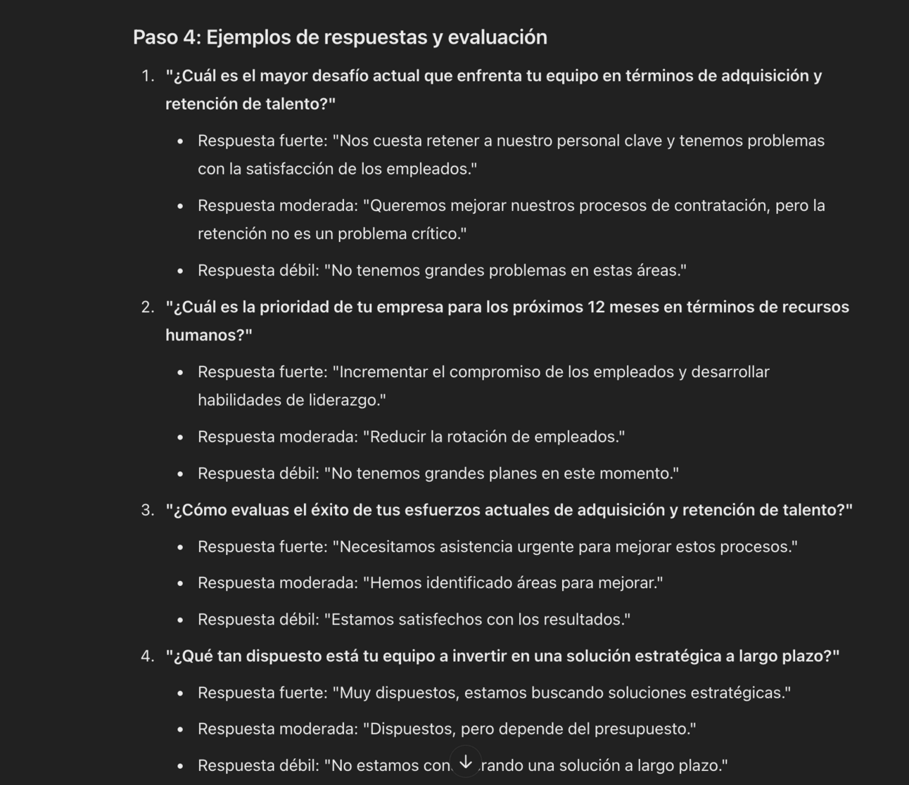 4. **Genera ejemplos de respuestas:** Para cada pregunta, proporciona **3-5 ejemplos de respuestas** que puedan ayudar a evaluar la adecuación del lead al producto. Clasifica estos ejemplos en respuestas que indicarían un fuerte ajuste, un ajuste moderado o un ajuste débil, en función de los objetivos, desafíos y disposición para la compra del lead.