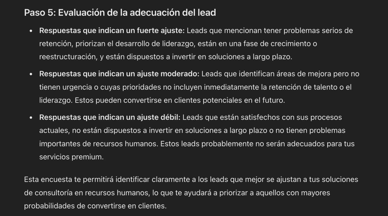 Eficiencia en la Calificación: Te ayuda a diseñar preguntas que eficientemente califican o descalifican leads, ahorrando tiempo y recursos en el proceso de ventas.