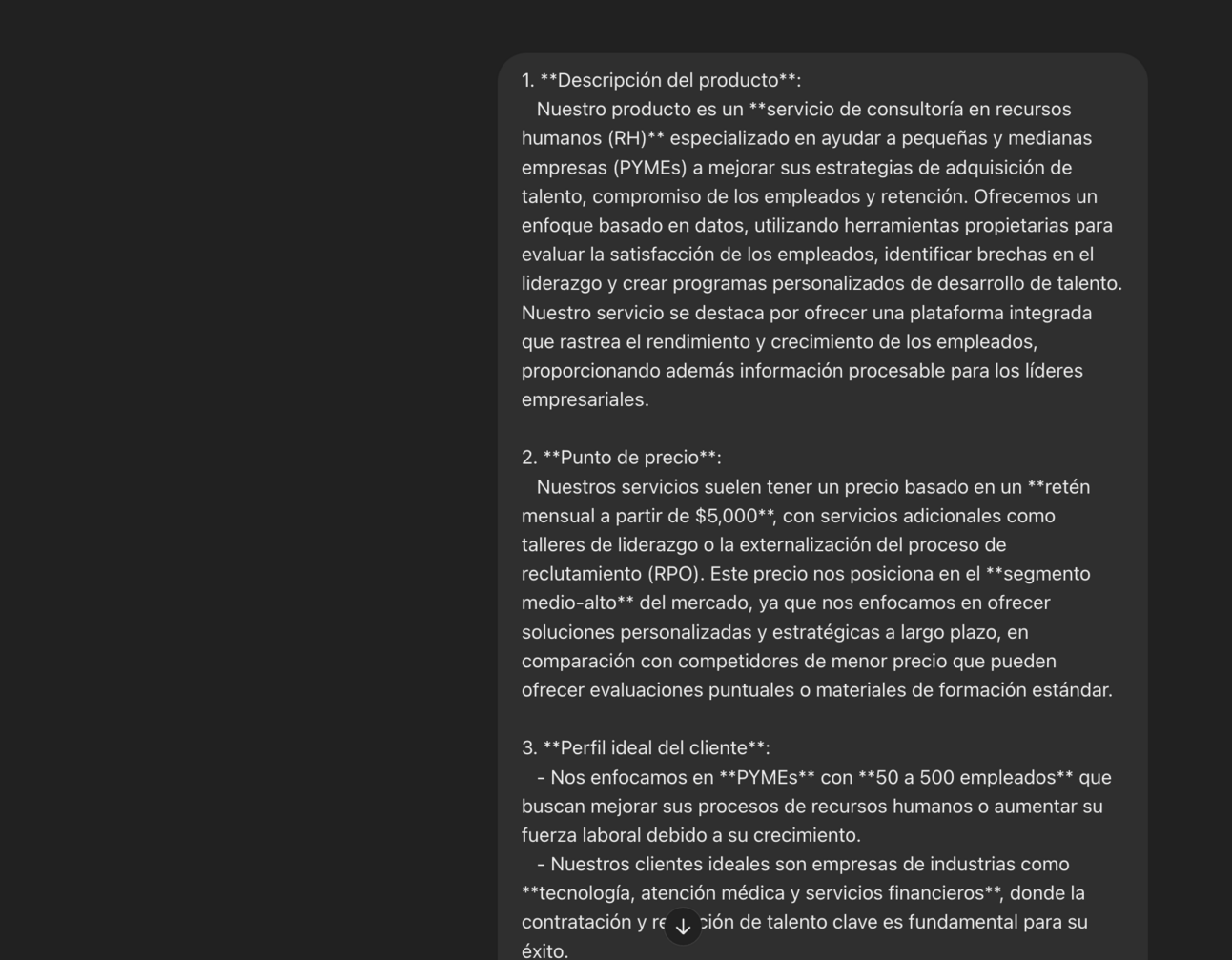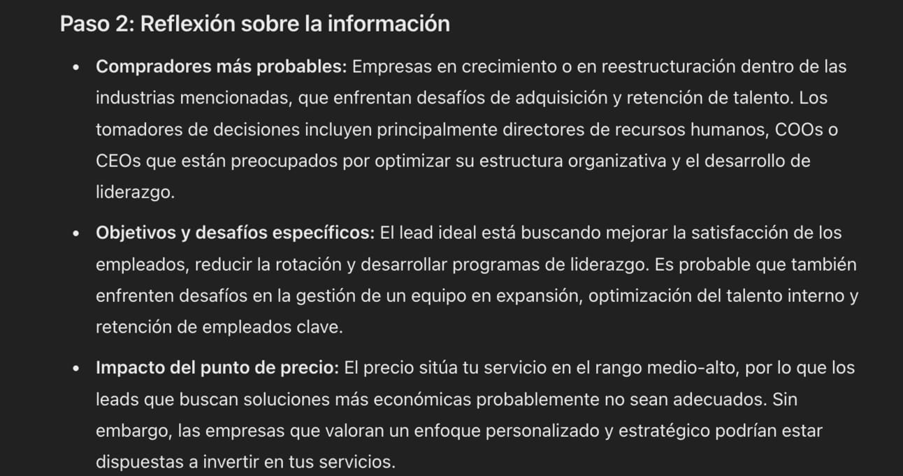 - **Perfil ideal del cliente:** ¿A qué tipo de empresas o individuos estás apuntando? ¿A qué industria o roles específicos pertenecen?