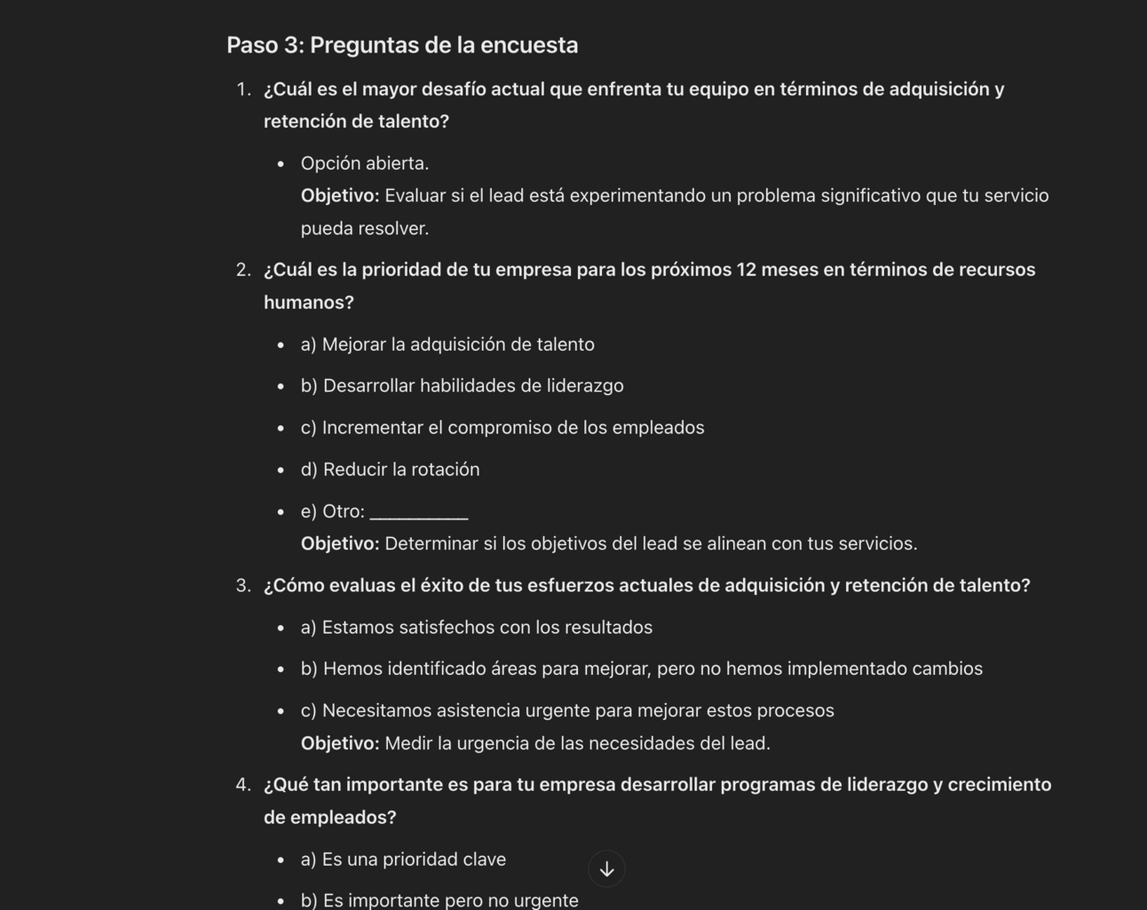 Expansión a Nuevos Mercados: El prompt te guiará en la creación de encuestas que ayuden a entender las necesidades y desafíos de leads en nuevos segmentos de mercado.