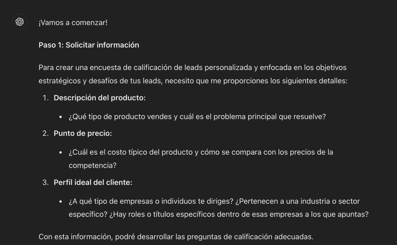 Lanzamiento de Nuevos Productos: Utilizarás el prompt para crear encuestas que evalúen el interés y la adecuación de los leads para un nuevo producto o servicio.