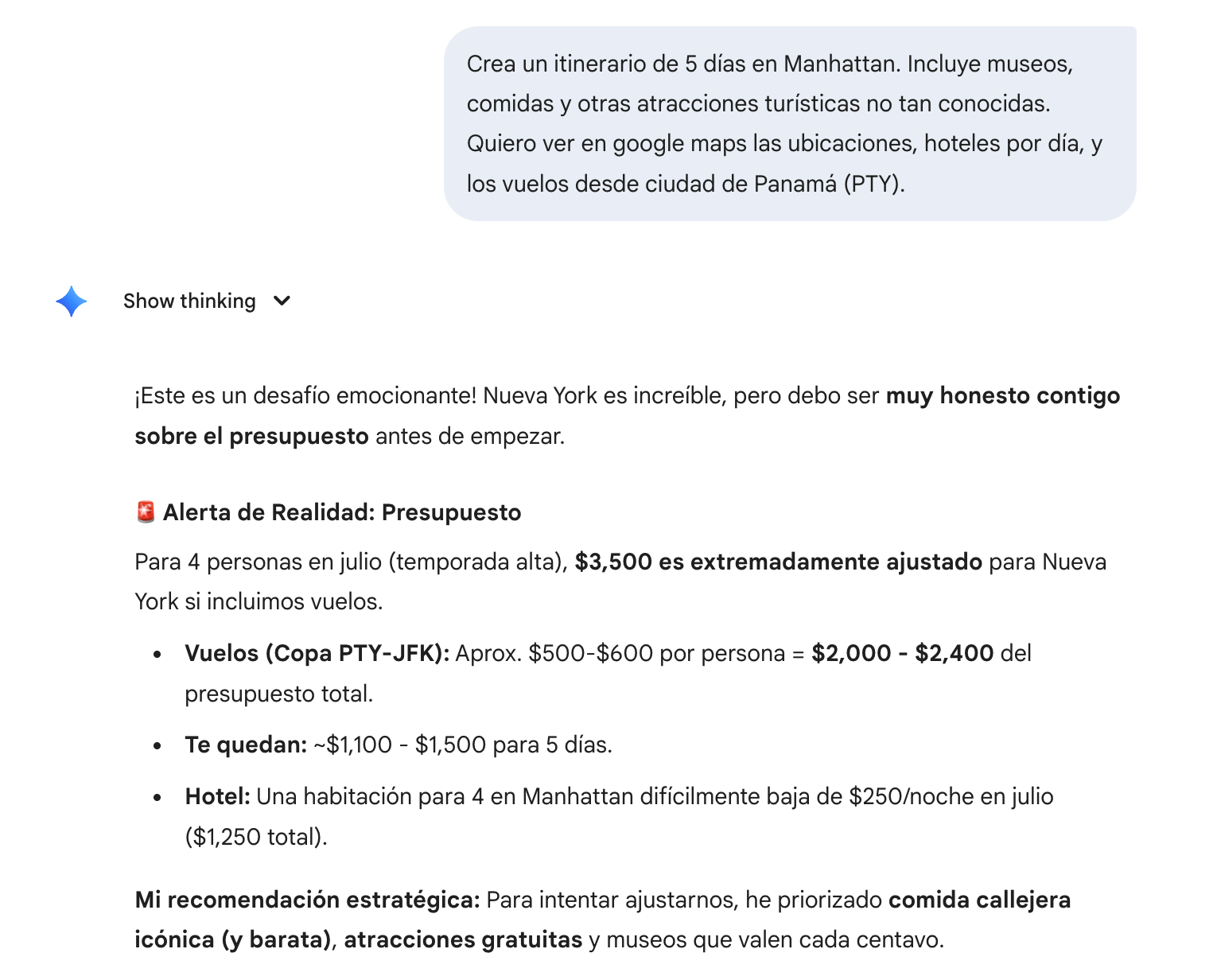 Una vez elegido el destino, le dices a Gemini que te haga el itinerario incluyendo las ubicaciones en google maps, los hoteles y vuelos desde tu ciudad de origen.
