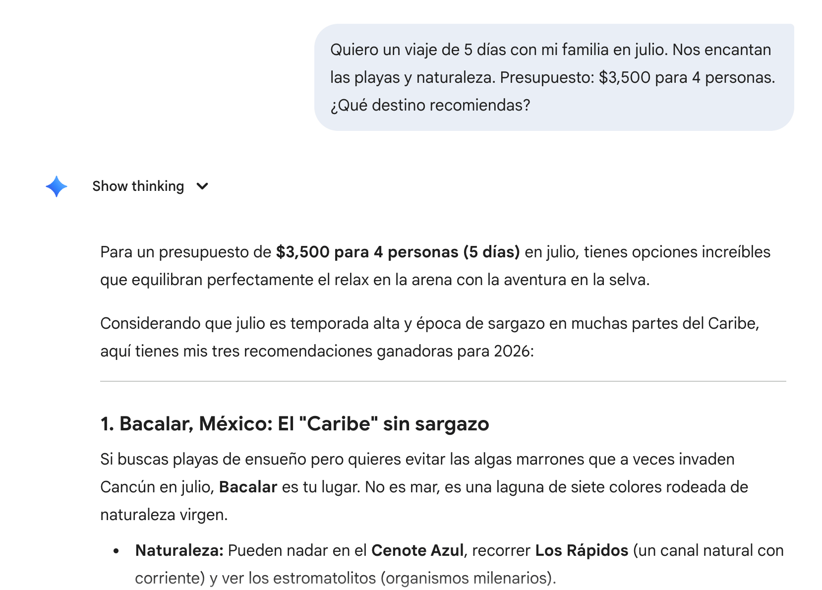 "Quiero un viaje de 5 días con mi familia en julio. Nos encantan las playas y naturaleza. Presupuesto: $3,500 para 4 personas. ¿Qué destino recomiendas?"